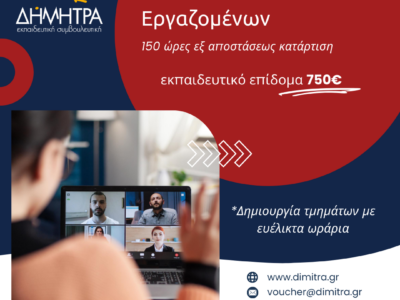 Η εταιρία μας «ΔΗΜΗΤΡΑ» Εκπαιδευτική Συμβουλευτική Α.Ε. με οδηγό την τριαντάχρονη εμπειρία, σε Εθνικό και Διεθνές επίπεδο, αξιοποιώντας τις πλέον σύγχρονες μεθόδους και τεχνικές εκπαίδευσης, υλοποιεί δράσεις κατάρτισης και απασχόλησης που απευθύνονται σε όλες τις ομάδες του πληθυσμού ανέργους, εργαζόμενους, αυτοαπασχολούμενους αλλά και επιχειρηματίες. Παράλληλα υποστηρίζει την επιχειρηματικότητα παρέχοντας υπηρεσίες συμβουλευτικής από έμπειρους και εξειδικευμένους συμβούλους, καταξιωμένους στο χώρο τους, για την δημιουργία νεοφυών επιχειρήσεων (start up), αλλά και σε ήδη υφιστάμενες επιχειρήσεις και επιχειρηματίες εστιάζοντας στα σημαντικότερα θέματα της λειτουργίας των επιχειρήσεων όπως η οργάνωση, η χρηματοδότηση, το marketing κ.α.